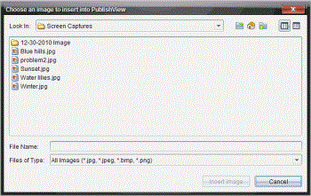 PublishView™-asiakirjoihin voi lisätä kuvia PublishView™-objekteina, tai kuvia voi lisätä kuvia tukevien TI-Nspire™-sovellusten sisällä. Tuetut tiedostotyypit ovat bmp, .jpg ja .png.