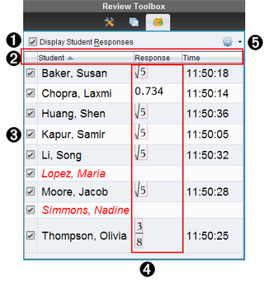 Näyttää opiskelijoiden nimet ja vastaukset Tiedon tarkasteluruudussa. |