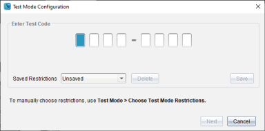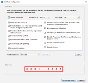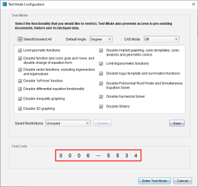 Huomaa: Tämä koskee TI-Nspire™ CX- ja TI-Nspire™ CX CAS -ohjelmistoja, ellei toisin mainita. Jos et tiedä testikoodia, voit saada sen käyttämällä Valitse rajoitukset -menetelmää.