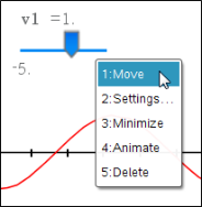 | 1. | Kuvaaja-, Geometria- tai Data & Tilasto -sivulta valitse Toiminnot > Lisää liukusäädin. —tai— Tarkasta Muistiinpanosivulla, ettei kursori ole matematiikka- tai kemiaruudussa, ja valitse sitten Lisää > Lisää liukusäädin. |
