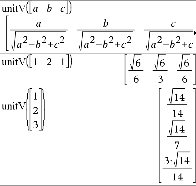 unitV(Vecteur1)Þvecteur Donne un vecteur unitaire ligne ou colonne, en fonction de la nature de Vecteur1. Vecteur1 doit être une matrice d'une seule ligne ou colonne. |