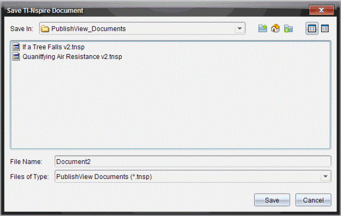 Nota: È anche possibile utilizzare l'opzione Salva con nome per convertire documenti da file TI-Nspire™ in file PublishView™ oppure per convertire file PublishView™ in file TI-Nspire™.