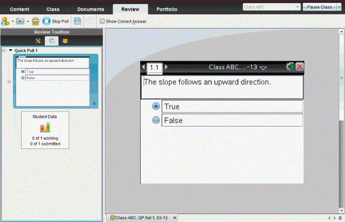 I test inviati in una sessione di classe sono contenuti in una scheda Test rapido nell'area di lavoro Revisione. Ogni nuova domanda è aggiunta come nuova attività nell'ordinatore pagine, ed il software apre automaticamente l'ultima domanda che è stata inviata. Una nuova scheda è avviata quando il test supera le 30 domande.