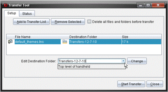 | • | Dall'elenco a discesa Modifica cartella di destinazione, selezionare “Livello superiore del palmare” o una cartella disponibile. |