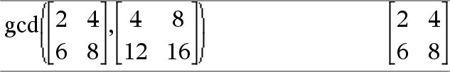 gcd(Matrise1, Matrise2)Þmatrise Returnerer største felles divisorer av samsvarende deler i Matrise1 og Matrise2. |