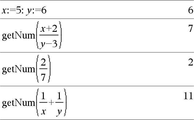 getNum(Brøk1)Þverdi Omformert argumentet til et uttrykk som har en redusert felles nevner og returnerer så uttrykkets teller. |