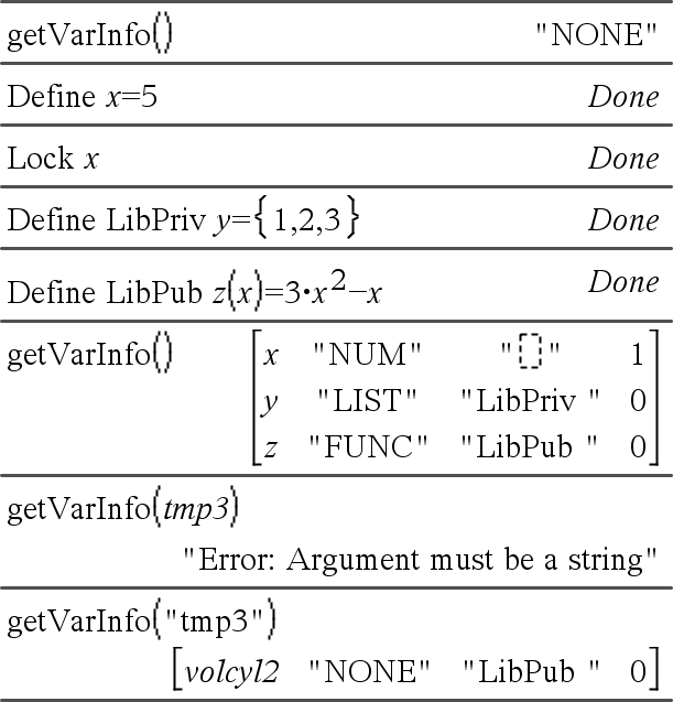 getVarInfo()Þmatrise eller streng getVarInfo(BibliotekNavnStreng)Þmatrise eller streng getVarInfo() returnerer en matrise med informasjon (variabelnavn, type, bibliotektilgjengelighet og låst/opplåst status) for alle variabler og biblioteksobjekter som er definert i den aktuelle oppgaven. Hvis ingen variabler er definert, returnerer getVarInfo() strengen "INGEN". getVarInfo(BibliotekNavnStreng)returnerer en matrise med informasjon for alle bibliotekobjektene som er definert i biblioteket BibliotekNavnStreng. BibliotekNavnStreng må være en streng (tekst omsluttet av anførselstegn) eller en strengvariabel. Hvis biblioteket BibliotekNavnStreng ikke finnes, oppstår det en feil. |