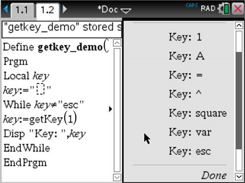getKey([0|1]) ⇒ returnString Beskrivelse:getKey() – tillater at et TI-Basic-program henter tastaturinndata – grafregner, stasjonær PC og emulator på skrivebordet. Eksempel: