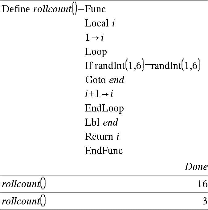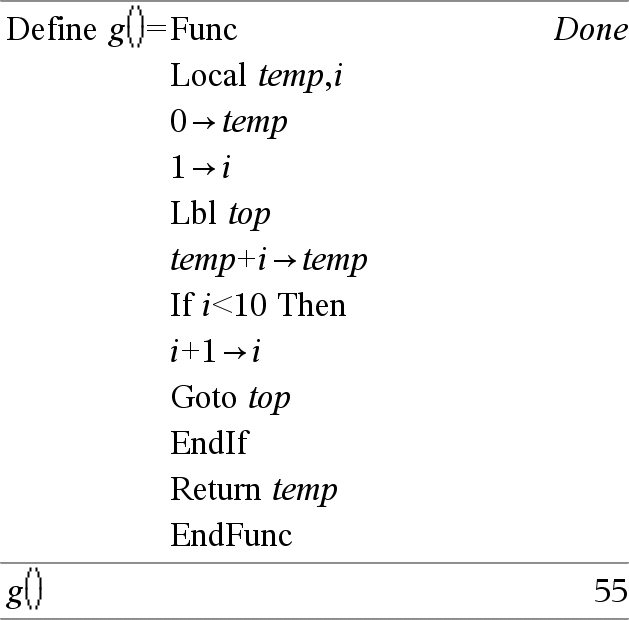 Loop Blokk EndLoop Utfører utsagnene gjentatte ganger i Blokk. Merk at stigningstallet utføres uendelig, hvis ikke en Goto eller Exit instruksjon utføres innenfor Blokk. Blokk er en sekvens av utsagn som er adskilt med tegnet. Merk for å legge inn eksemplet: For anvisninger om hvordan du legger inn flerlinjede program- og funksjonsdefinisjoner, se avsnittet Kalkulator i produkthåndboken. |