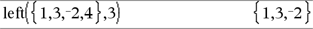 left(Liste1[, Num])Þliste Returnerer de Num-elementene som ligger lengst til venstre i Liste1. Hvis du utelater Num, returneres alle elementer i Liste1. |