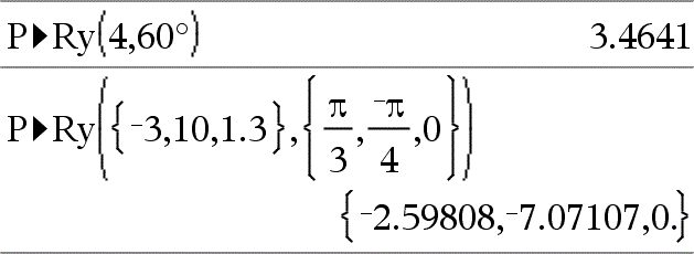 P4Ry(rVerdi, qVerdi)Þverdi P4Ry(rListe, qListe)Þliste P4Ry(rMatrise, qMatrise)Þmatrise Returnerer ekvivalent y-koordinat av (r, q)-paret. Merk: q-argumentet tolkes enten som grader, gradianer eller radianer, avhengig av aktuell vinkelmodus. Merk: Du kan sette inn denne funksjonen fra datamaskintastaturet ved å skrive P@>Ry(...). |