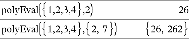 polyEval(Liste1, Uttr1)Þuttrykk polyEval(Liste1, Liste2)Þuttrykk Tolker det første argumentet som koeffisienter for et polynom med fallende eksponenter, og returnerer en utregnet verdi av polynomet, innsatt verdien av det andre argumentet. |