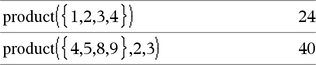 product(Liste[, Start[, slutt]])Þuttrykk Returnerer produktet av elementene i Liste. Start og Slutt er valgfrie. De spesifiserer et elementområde. |
