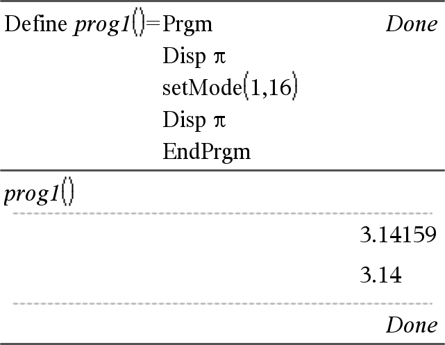 SetMode(modusNavnHeltall, innstillingHeltall) Þheltall SetMode(liste) Þheltallsliste Kun gyldig innenfor en funksjon eller et program. SetMode(modusNavnHeltall, innstillingHeltall) setter foreløpig modus modusNavnHeltall til den nye innstillingen innstillingHeltall, og returnerer et heltall som samsvarer med den opprinnelige innstillingen av den modusen. Endringen er begrenset til hvor lenge det varer å utføre programmet/funksjonen. modusNavnHeltall spesifiserer hvilken modus du vil stille inn. Det må være en av modus-heltallene fra tabellen nedenfor. innstilleHeltall spesifiserer den nye innstillingen for modusen. Det må være en av innstillingsheltallene fra listen nedenfor for den spesifikke modusen som du stiller inn. SetMode(liste) lar deg endre flere innstillinger. liste inneholder tallpar med modusheltall og innstillingeheltall. SetMode(liste) returnerer en liknende liste med heltallpar som representerer de opprinnelige modusene og innstillingene. Hvis du har lagret alle modusinnstillinger med SetMode(0) & var, kan du bruke SetMode(var) for å gjenopprette disse innstillingene til funksjonen eller programmet lukkes. Se SetMode(), her. Merk: De aktuelle modusinnstillingene sendes til påkalte underrutiner. Hvis en underrutine endrer en modusinnstilling, går modusinnstillingen tapt når kontrollen går tilbake til påkallingsrutinen. Merk for å legge inn eksemplet: For anvisninger om hvordan du legger inn flerlinjede program- og funksjonsdefinisjoner, se avsnittet Kalkulator i produkthåndboken. |