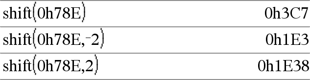 shift(Liste1 [,#avSkift])Þliste Returnerer en kopi av Liste1 skiftet til høyre eller til venstre av #avSkift-elementer. Endrer ikke Liste1. Hvis #avSkift er positiv, er skift til venstre. Hvis #avSkift er negativ, er skift til høyre. Grunninnstillingen er L1 (skiftes et element til høyre). Elementer som introduseres ved begynnelsen eller slutten av liste ved skiftet er satt til symbolet “udef”. |