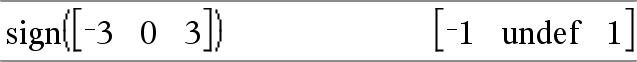 sign(Verdi1)Þverdi sign(Liste1)Þlist e sign(Matrise1)Þmatrise For reell og komplekst Verdi1, returnerer Verdi1 / abs(Verdi1) når Verdi1 ƒ 0. Returnerer 1 hvis Verdi1 er positiv. Returnerer L1 hvis Verdi1 er negativ. sign(0) returnerer „1 hvis kompleks formatmodus er Reell; ellers returnerer den seg selv. sign(0) representerer enhetssirkelen i den komplekse grunnmengden. For en liste eller matrise returneres fortegnene for alle elementene. |