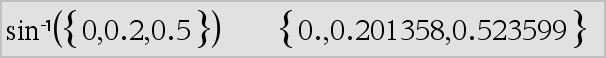 sin/(Liste1) returnerer en liste over invers sinus til hvert element i Liste1. Merk: Resultatet returneres som en vinkel i enten grader, gradianer eller radianer, avhengig av aktuell vinkelmodus-innstilling. Merk: Du kan sette inn denne funksjonen fra tastaturet ved å skrive arcsin(...). |