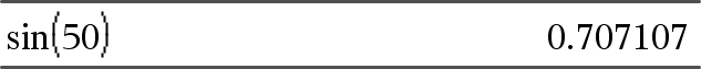 sin(Liste1) returnerer en liste over sinus til alle elementer i Liste1. Merk: Argumentet tolkes som grader, gradianer eller som radianer, avhengig av aktuell vinkelmodus. Du kan bruke ¡, G, eller R for å hoppe over vinkelmodusen midlertidig. |