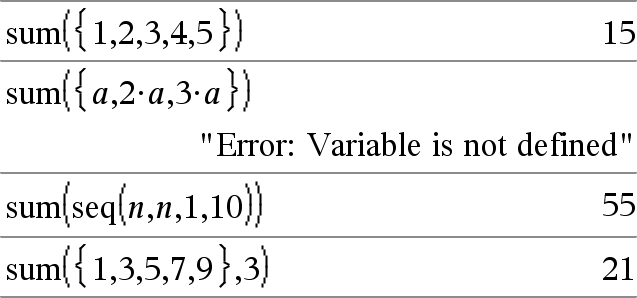 sum(Liste[, Start[, Slutt ]])Þuttrykk Returnerer summen av elementene i Liste. Start og Slutt er alternativer. De spesifiserer et elementområde. Et tomt utsagn produserer et tomt resultat. Tomme (åpne) elementer i Liste ignoreres. For mer informasjon om tomme elementer, se her. |