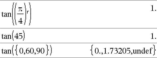 tan(Liste1) returnerer en liste over tangensene til alle elementene i Liste1. Merk: Argumentet tolkes som grader, gradianer eller som radianer, avhengig av aktuell vinkelmodus. Du kan bruke ¡, G, eller R for å hoppe over vinkelmodusen midlertidig. |