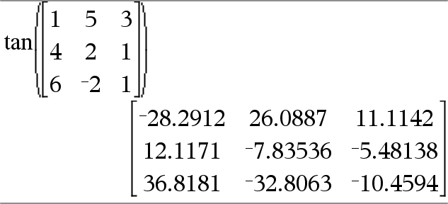tan/(kvadratMatrise1)ÞkvadratMatrise Returnerer matrisens inverse tangens til kvadratMatrise1. Dette er ikke det samme som å beregne invers tangens til hvert element. For mer informasjon om beregningsmetode, se under cos(). kvadratMatrise1 må kunne diagonaliseres. Resultatet inneholder alltid flytende desimaltall. |
