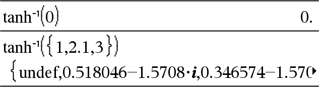 tanh/(Liste1) returnerer en liste over invers hyperbolsk tangens til hvert element i Liste1. Merk: Du kan sette inn denne funksjonen fra tastaturet ved å skrive arctanh(...). |