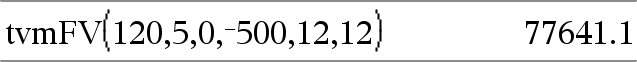 tvmFV(N,I,PV,Pmt,[PpY],[CpY],[PmtAt])Þverdi Finansiell funksjon som beregner fremtidig verdi for penger. Merk: Argumenter som brukes i TVM-funksjonene er beskrevet i tabellen over TVM-argumenter, her. Se også amortTbl(), her. |