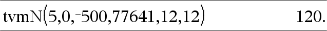 tvmN(I,PV,Pmt,FV,[PpY],[CpY],[PmtAt])Þverdi Finansiell funksjon som beregner antallet betalingsperioder. Merk: Argumenter som brukes i TVM-funksjonene er beskrevet i tabellen over TVM-argumenter, her. Se også amortTbl(), her. |