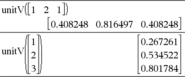 unitV(Vektor1)Þvektor Returnerer enten en rad- eller kolonne-enhetsvektor, avhengig av formen på Vektor1. Vektor1 må være enten en enkel-rad-matrise eller en enkel-kolonne-matrise. |