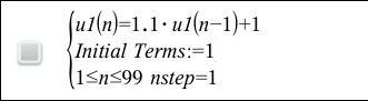 | 3. | Skriv et innledende ledd. Hvis sekvensens uttrykk henviser til mer enn ett tidligere uttrykk, for eksempel u1(n-1) og u1(n-2), (eller u1(n) og u1(n+1)), må du skille uttrykkene med kommaer. |