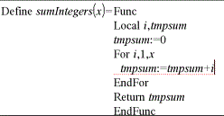 | 1. | På Kalkulator-kommandolinjen, skriv inn Definer sumIntegers(x)=. Vent med å trykke på Enter. |