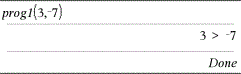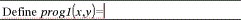 | 1. | På Kalkulator-kommandolinjen, skriv inn Definer prog1(x,y)=. Vent med å trykke på Enter. |