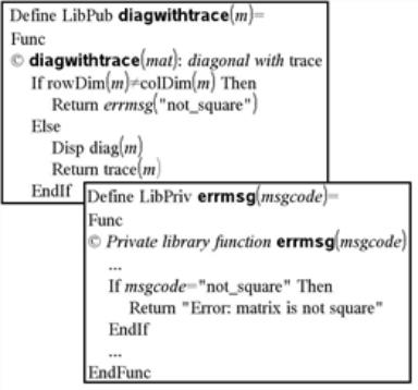 Anta for eksempel at du har opprettet bibliotekdokumentet matrix som inneholder den felles bibliotekfunksjonen diagwithtrace() og den private bibliotekfunksjonen errmsg().