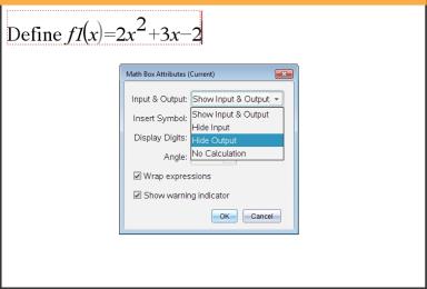 Trykk på og skjul utdata ved å bruke dialogboksen Attributter for matematisk uttrykksboks. |