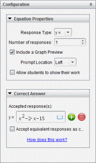 Åpne konfigurasjonsverktøyet for å angi antall svar, det korrekte svaret og om elevene skal vise arbeidene sine. Du kan også legge til en graf som vil vises i spørsmålsområdet. |
