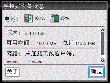 查看电池状态有两种方法: 连接到手持设备时,或者通过查看 LED 灯。 当实验室底座连接到 TI-Nspire™ 手持设备时,您可以查看这两者的电池状态。 第一个值是手持设备的,第二个值是实验室底座的。