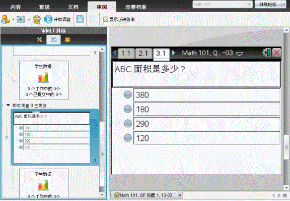 一个班级会话中发送的调查均包含在“审阅”工作区的“快速调查”选项卡中。 每个新问题均被添加至页面检视器中,而且软件会自动打开最新发送的问题。 当某项调查所含问题超过 30 个时,就会启用新的选项卡。
