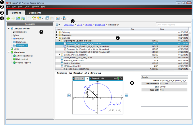 内容窗格。 显示选定资源的内容。 如同使用文件管理器一样使用内容窗格,以定位和查看计算机或已连接手持设备上的文件夹、课程包、TI-Nspire™ 和 PublishView™ 文档。 单击 获取适用于选定文件夹或 TI-Nspire™ 文档的选项。