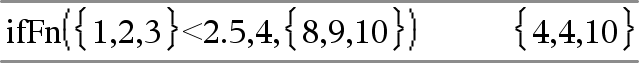 ifFn(布林運算式,若為真的值 [,若為假的值 [,若未知的值]]) ⇒ 運算式、列表或矩陣 對布林運算式(或布林運算式中的各元素)求值,並根據以下規則求出結果: