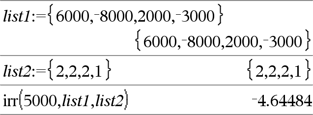 irr(CF0,CF列表 [,CF頻率]) ⇒ 值 可計算內部投資報酬率的財務函數。 CF0 是時間為 0 時的初始現金流量,必須是實數。 CF列表是初始現金流量 CF0 之後的現金流量金額列表。 CF頻率是選用的列表,其中各元素可用於指定群組(相鄰)現金流量金額(CF列表對應元素)的出現頻率。預設值是 1;若您輸入值,則必須是 < 10,000 的正整數。 注意:另請參考 mirr(),這裡. |