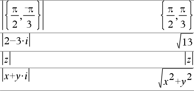 abs(運算式1)Þ運算式 abs(列表1)Þ列表 abs(矩陣1)Þ矩陣 傳回引數的絕對值。 附註: 另請參考絕對值範本,這裡。 如果引數是複數,則傳回數字的模數。