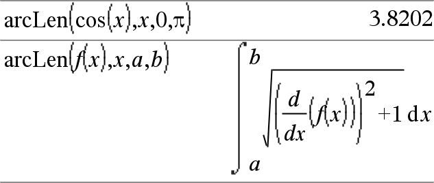 arcLen(運算式1,Var,起點,終點) Þ運算式 傳回 運算式1 從起點到終點的弧長(對 Var 變數)。 計算弧長時,將以用函數模式定義的積分計算。 |