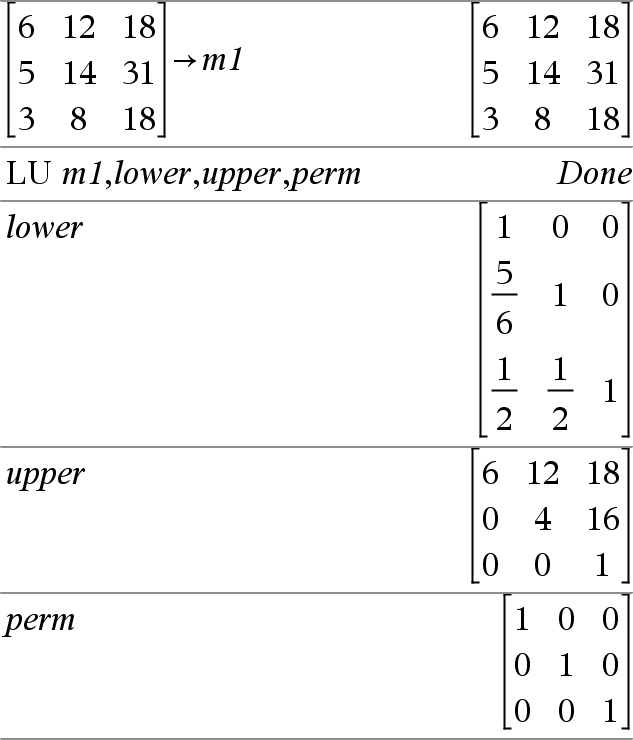 LU 矩陣, l矩陣, u矩陣, p矩陣[,Tol] 計算實數或複數矩陣的 Doolittle LU 上下分解值。l矩陣負責儲存下三角矩陣,u矩陣負責儲存上三角矩陣,p矩陣負責儲存置換矩陣(描述計算期間執行的列交換情形)。 l矩陣 · u矩陣 = p矩陣 · 矩陣 若任何矩陣元素的絕對值小於 Tol(容許值),則亦可將此元素視為零。只有在矩陣中包含浮點數項目,而且不包含尚未賦值的任何符號變數時,才會使用此容許值。其他時候都會忽略 Tol(容許值)。
