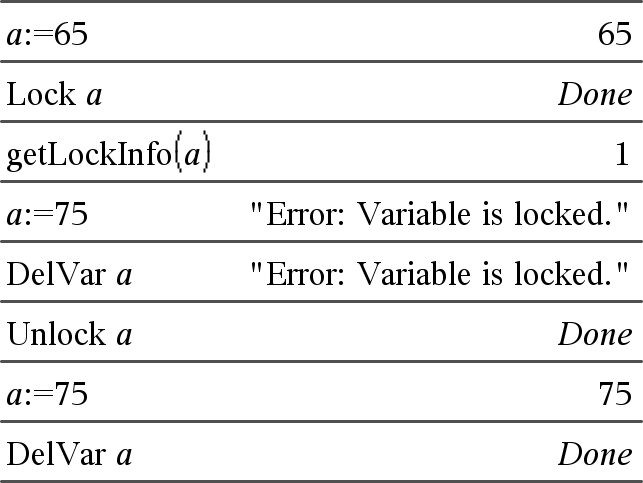 鎖定指定變數或變數群組。您無法修改或刪除已鎖定的變數。 您無法鎖定或解開鎖定 Ans 系統變數,也無法鎖定 stat.或 tvm 系統變數群組。 附註: 若將 Lock 指令用於已經解開鎖定的變數,則復原/重複功能的歷史記錄會遭到清除。 |