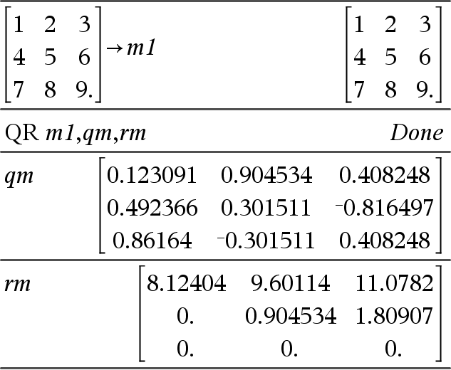 QR 矩陣, q矩陣, r矩陣[, Tol] 計算實數或複數矩陣的 Householder QR 分解值。系統會將求出的 Q、R 矩陣儲存到指定矩陣中。Q 矩陣是單一矩陣。R 矩陣是上三角矩陣。 若任何矩陣元素的絕對值小於 Tol(容許值),則亦可將此元素視為零。只有在矩陣中包含浮點數項目,而且不包含尚未賦值的任何符號變數時,才會使用此容許值。其他時候都會忽略 Tol(容許值)。
