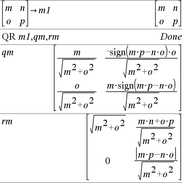 進行 QR 分解的數值計算時,會進行 Householder 轉換。計算符號解時會採用 Gram-Schmidt。qMatName 的行向量是單範正交基底向量,跨越矩陣定義的空間。 |