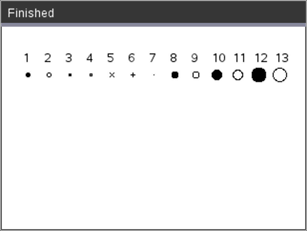 PlotXY x, y, Form x, y: Koordinate zur Plot-Form Form: eine Zahl zwischen 1 und 13, die die Form festlegt 1 – Gefüllter Kreis 2 – Leerer Kreis 3 – Gefülltes Quadrat 4 – Leeres Quadrat 5 – Kreuz 6 – Plus 7 – Dünn 8 – Mittelgroßer Punkt, ausgefüllt 9 – Mittelgroßer Punkt, unausgefüllt 10 – Großer Punkt, ausgefüllt 11 – Großer Punkt, unausgefüllt 12 – Größter Punkt, ausgefüllt 13 – Größter Punkt, unausgefüllt