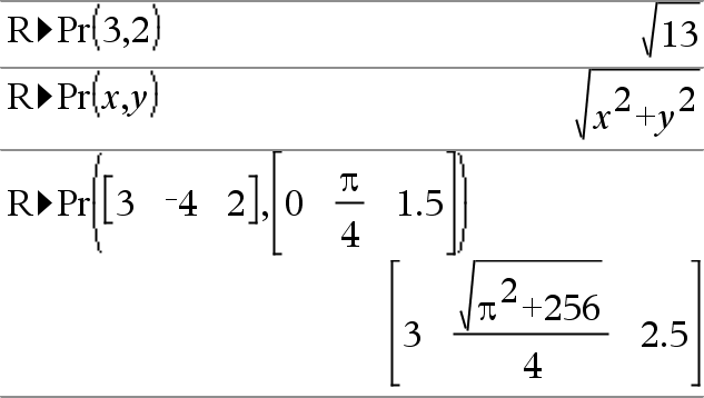 Gibt die äquivalente r-Koordinate des Paars (x,y) zurück. Hinweis: Sie können diese Funktion über die Tastatur Ihres Computers eingeben, indem Sie R@Pr(...) eintippen. |