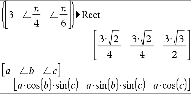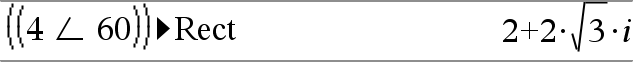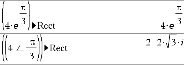 komplexer Wert ►Rect Zeigt komplexerWert in der kartesischen Form a+bi an. komplexerWert kann jede komplexe Form haben. Eine reiθ-Eingabe verursacht jedoch im Winkelmodus Grad einen Fehler. Hinweis: Für eine Eingabe in Polarform müssen Klammern (r∠θ) verwendet werden. |