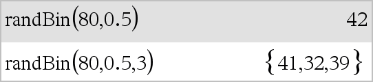 randBin(n, p) ⇒ Ausdruck randBin(n, p) gibt eine reelle Zufallszahl aus einer angegebenen Binomialverteilung zurück. randBin(n, p, #Trials) gibt eine Liste mit #Trials reellen Zufallszahlen aus einer angegebenen Binomialverteilung zurück. |